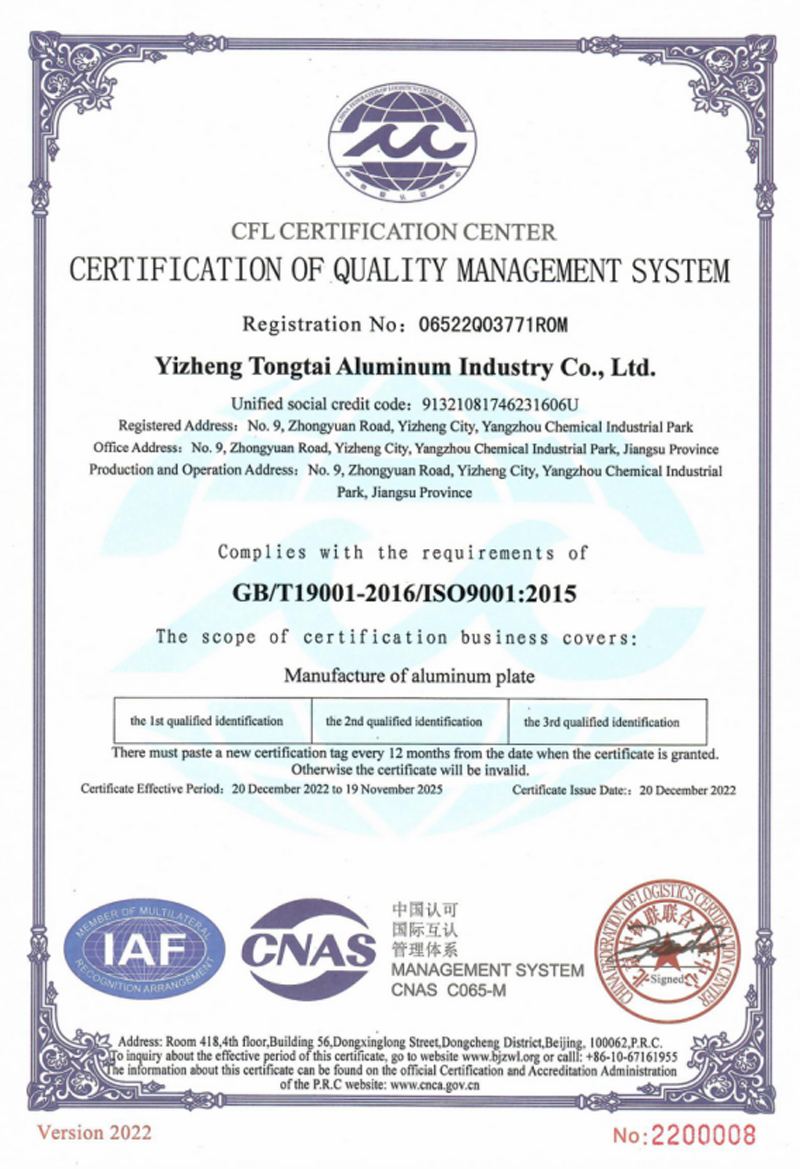 1、2022年12月20日儀征市同泰鋁業(yè)有限公司經(jīng)過(guò)北京中物聯(lián)聯(lián)合認證中心審核,認定公司的質(zhì)量管理體系符合GB/T19001-2016/ISO9001:2015標準要求,同意給予注冊并頒發(fā)質(zhì)量管理體系認證合格證書(shū)。